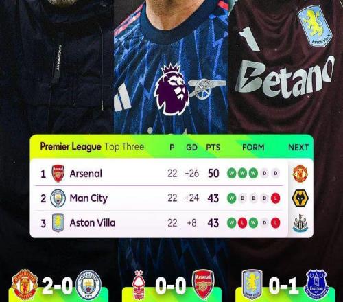 天佑阿森纳!曼城维拉爆冷输球枪手两连平仍7分领跑